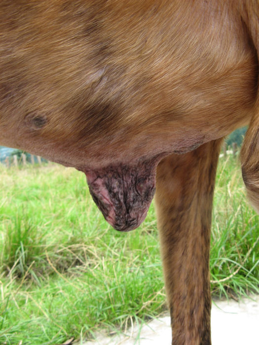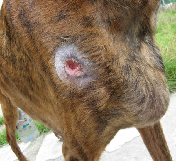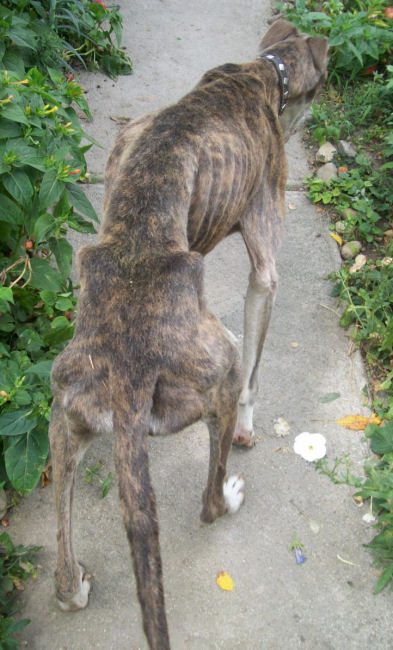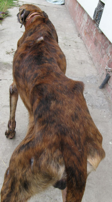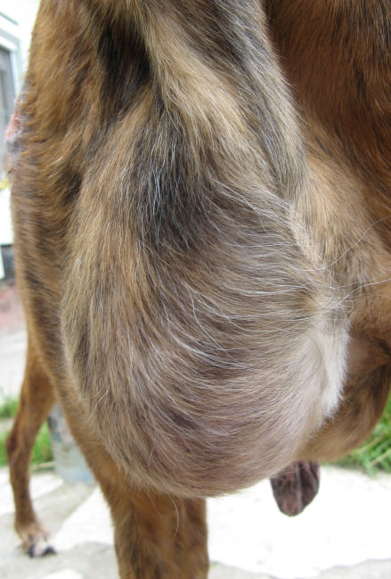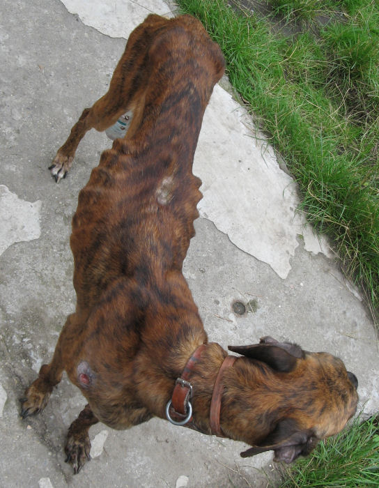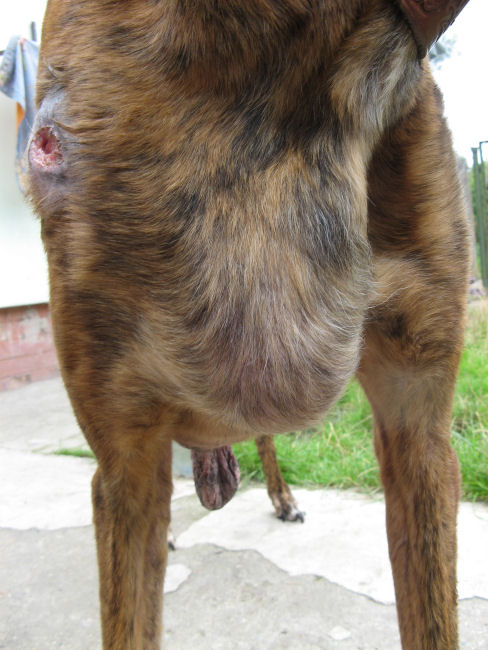 Dieser Rüde hat einige Geschwülste (am Bauch und am Hals), kahle Flecken über seinen Körper verteilt, eine abgestorbene Schwanzspitze und er ist auch sehr abgemagert.
