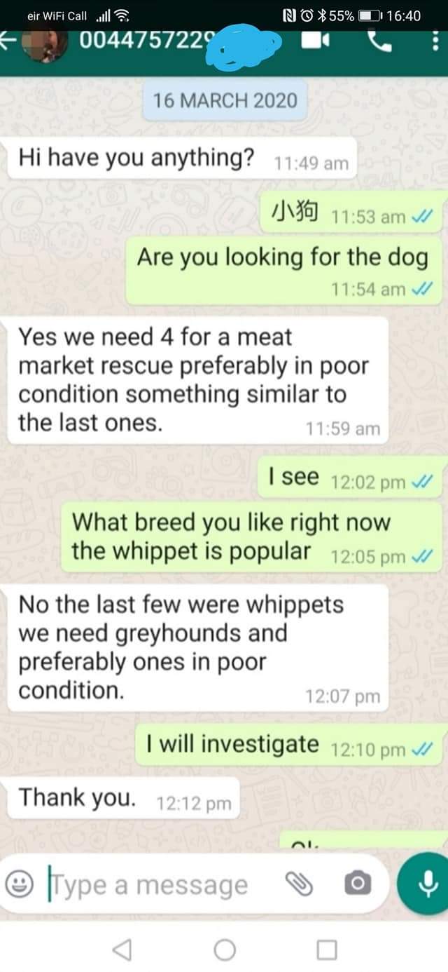 We are always told by the Animal Extremists in the UK and Ireland that Greyhounds are sent to China for the Meat Market. How strange that at NO stage have they ever been able to post the details of even One Irish or UK bred Dog Rescued from the Meat Market. This is not surprising as Plushbear Rescue in China confirmed to us that they have NEVER SEEN OR RESCUED an Irish or UK bred Greyhound.