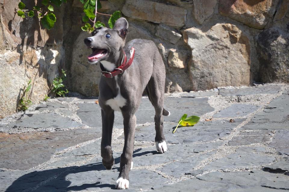 In Avalon (Irland) sitzt eine 13 Wochen alte blaue Greyhoundhündin.