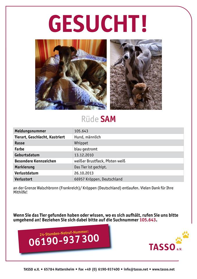 Es geht um den entlaufenden Whippet-Rüden Sam. Er ist am 26. Oktober unglücklicherweise entlaufen und findet nun den Weg nach Hause nicht mehr.