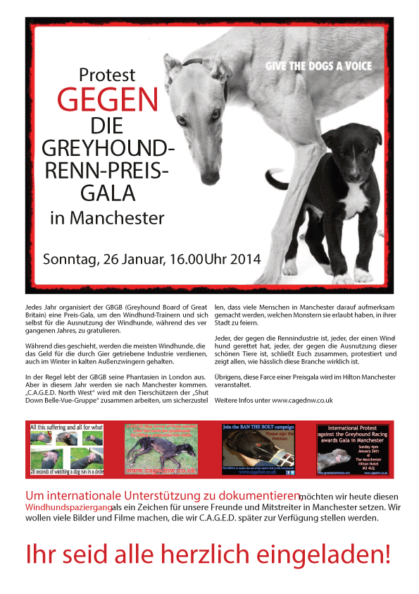 Um internationale Unterstützung zu dokumentieren, sehen wir diesen Windhundspaziergang am 26. Januar 2014 als Solidaritätsbekundung für unsere Freunde und Mitstreiter in Manchester an. Wir wollen unsere Solidarität mit den Greyhounds auf Bildern und Filmen dokumentieren, welche wir C.A.G.E.D. zur Verfügung stellen werden.
