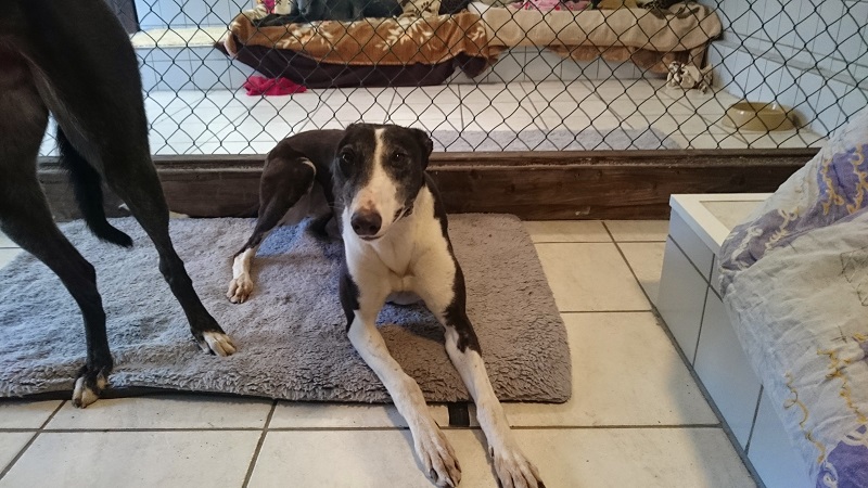 Victoria ist eine schwarz- weiße freundliche und aufgeschlossenen Greyhündin.